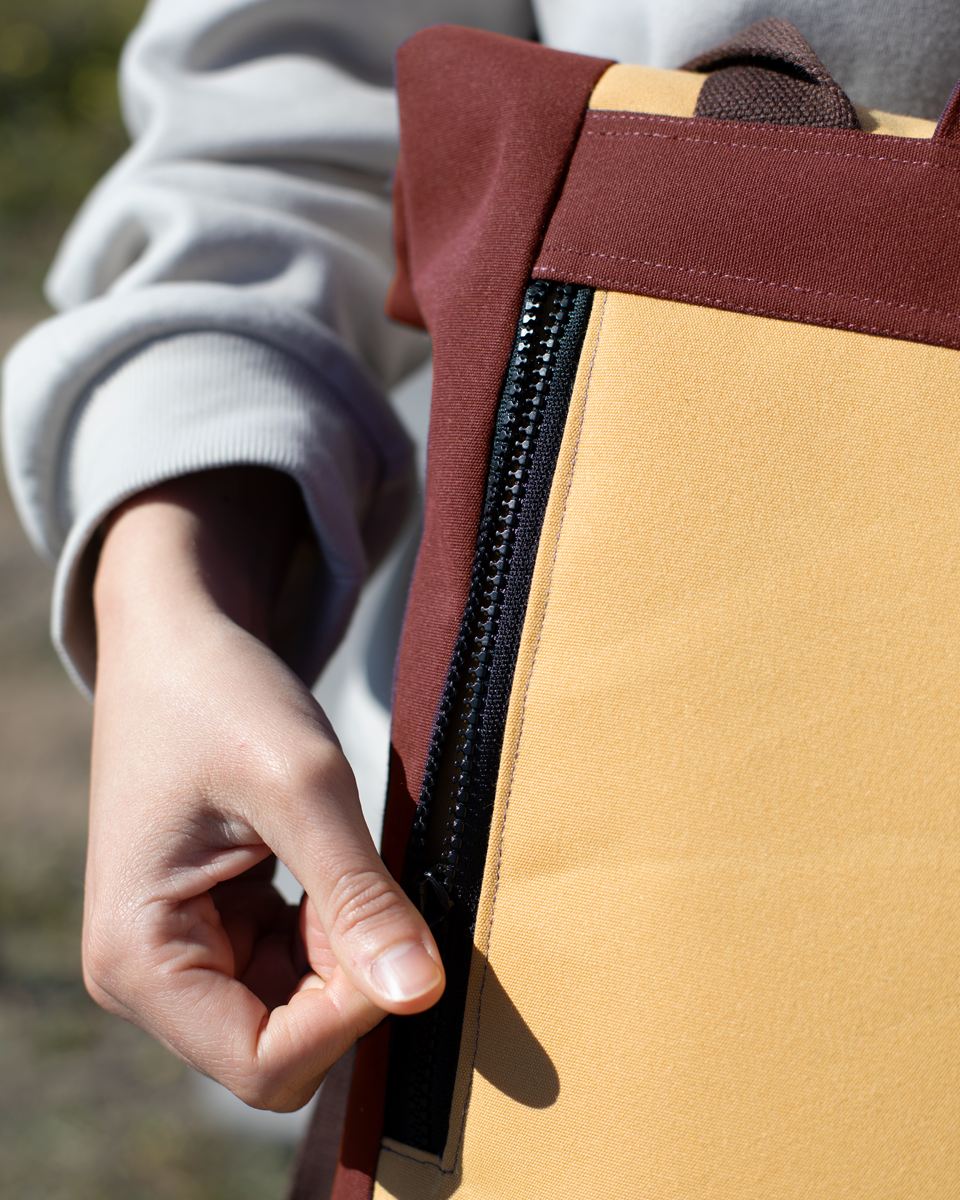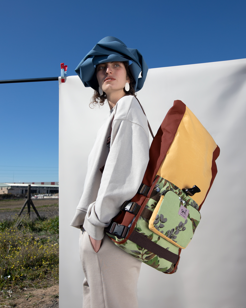 Perfecta para llevar la vida a cuestas. Realizado a partir de los residuos textiles de una fábrica de toldos. Cuenta con un compartimento acolchado en el interior para ordenadores y un bolsillo trasero. La riñonera funciona, además de bolsillo exterior para la mochila, como un elemento independiente separando la tercera cinta de la mochila y utilizándola como cinturón para llevar la riñonera.